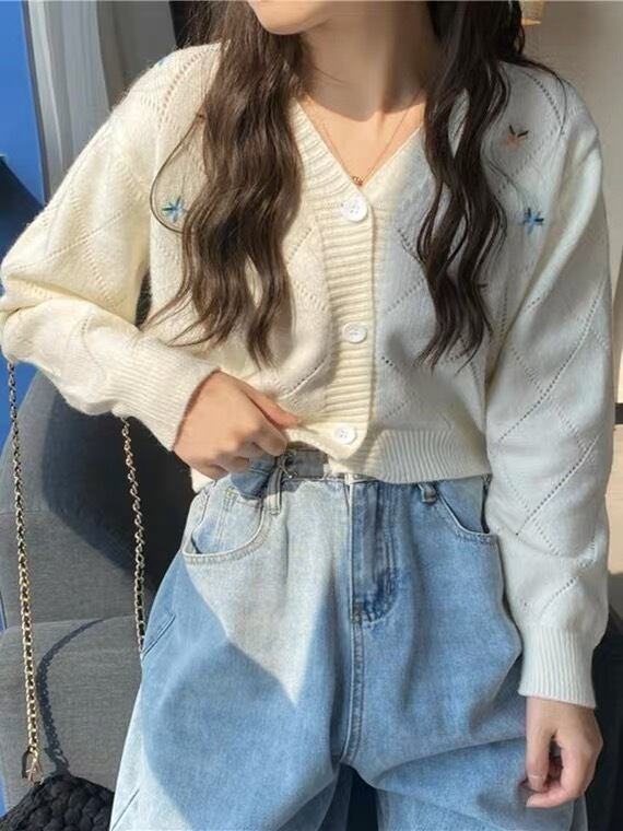 小さな花柄の刺繍が可愛いニットです。
