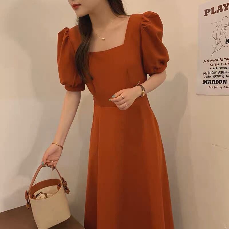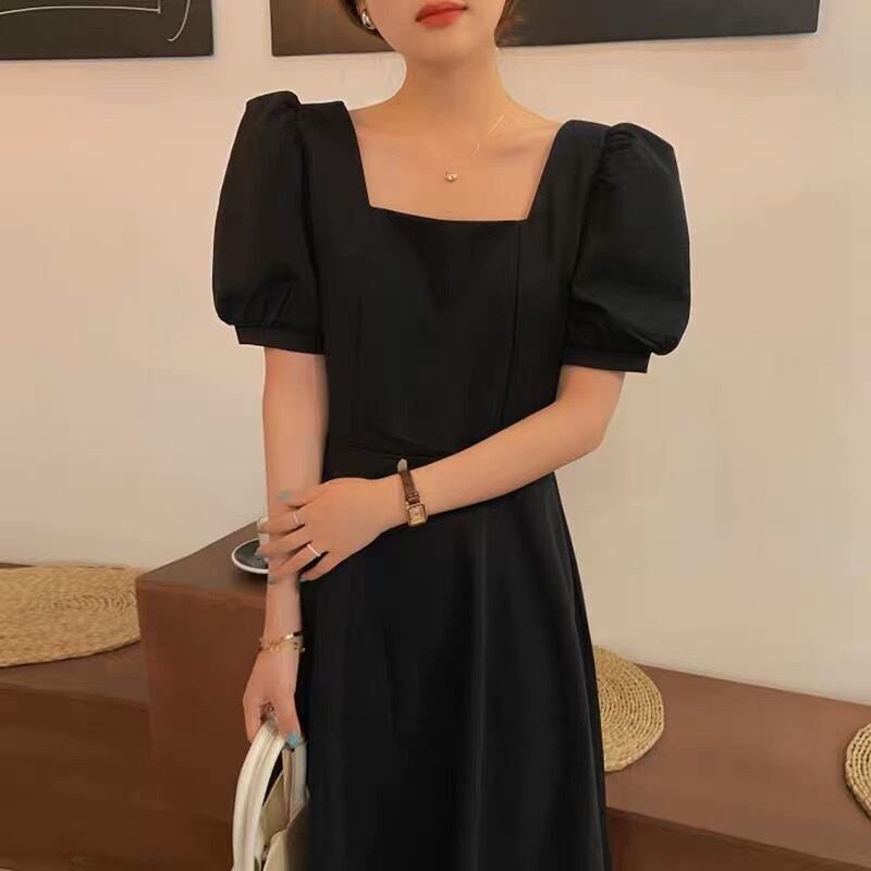 パフスリーブとスクエア襟が可愛いロング丈のワンピースです。