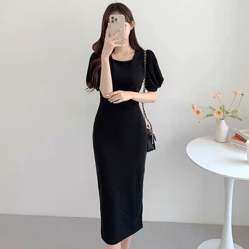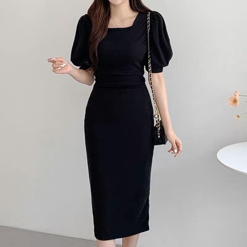 スタイル良く見える膝下丈のワンピースです。