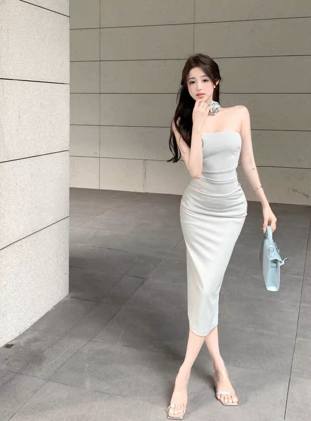 スタイル良く見えるチューブトップのタイトワンピースです。