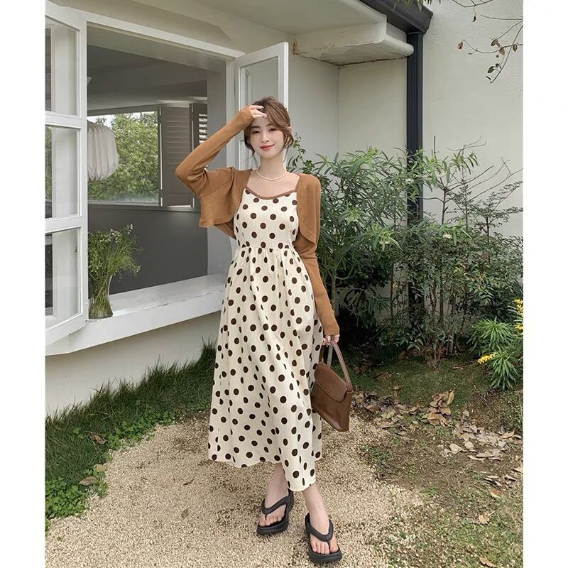 ドット柄が可愛いワンピースとカーディガンのセットです。