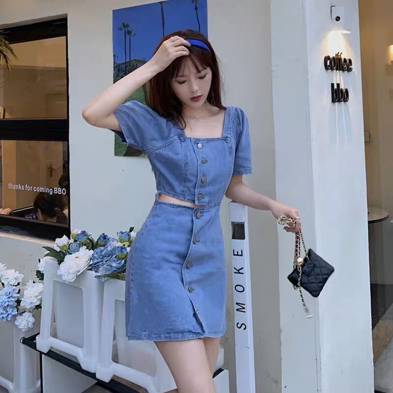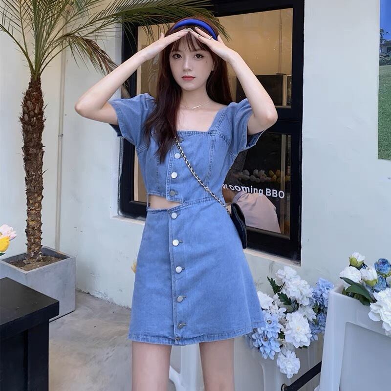 お腹のチラ見せが可愛いミニ丈のデニムワンピースです。