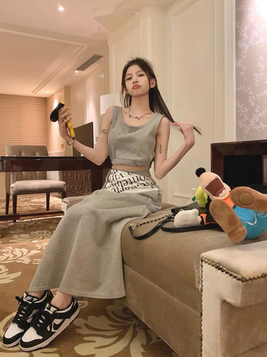 スタイル良く見えるノースリーブトップスとロング丈スカートのセットアップです。