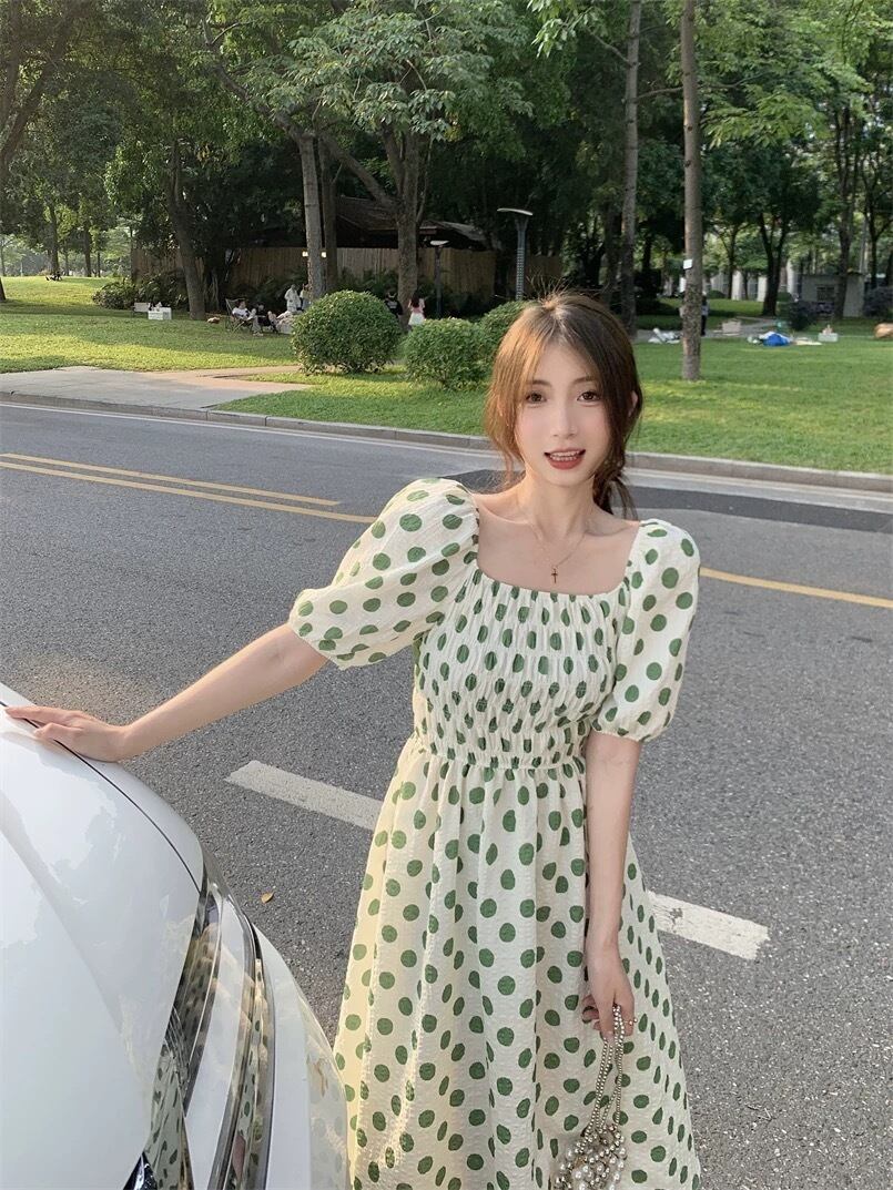 ドット柄と後ろのリボンが可愛いワンピースです。