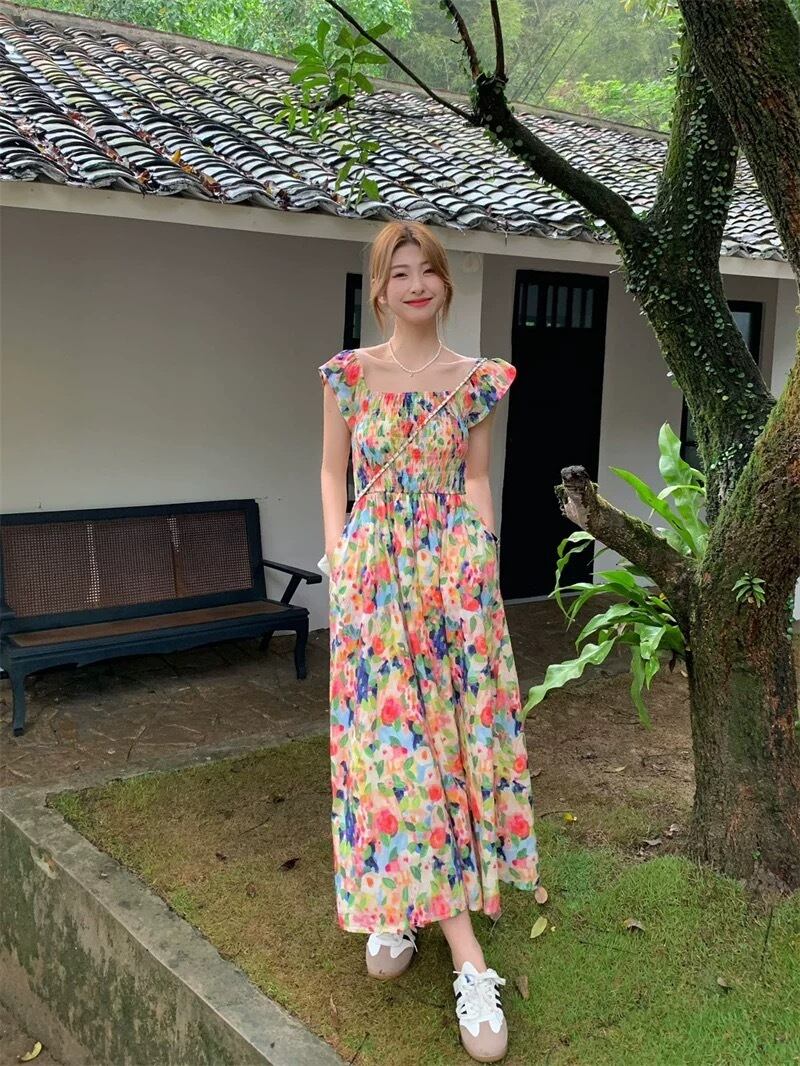 鮮やかな色合いの花柄が可愛いワンピースです。