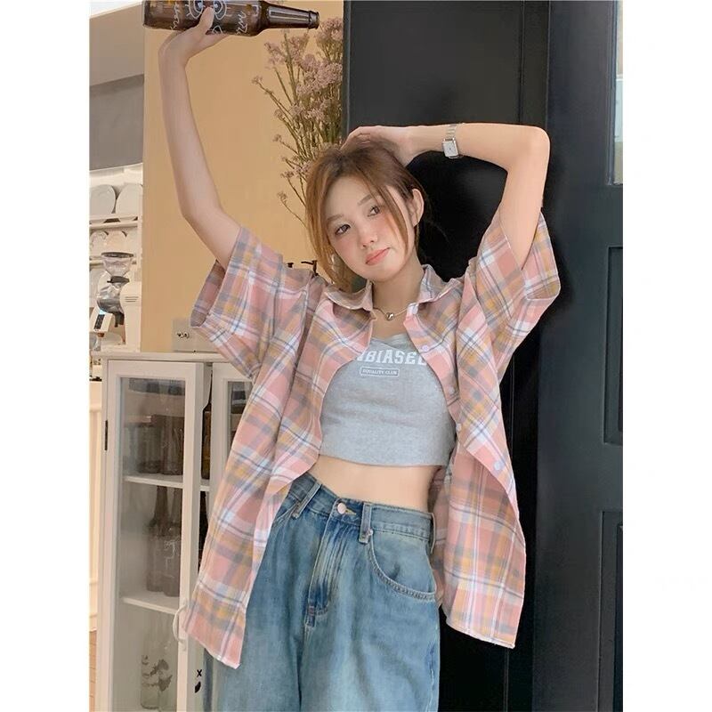ピンクのチェックが可愛いオーバーサイズの半袖シャツです。