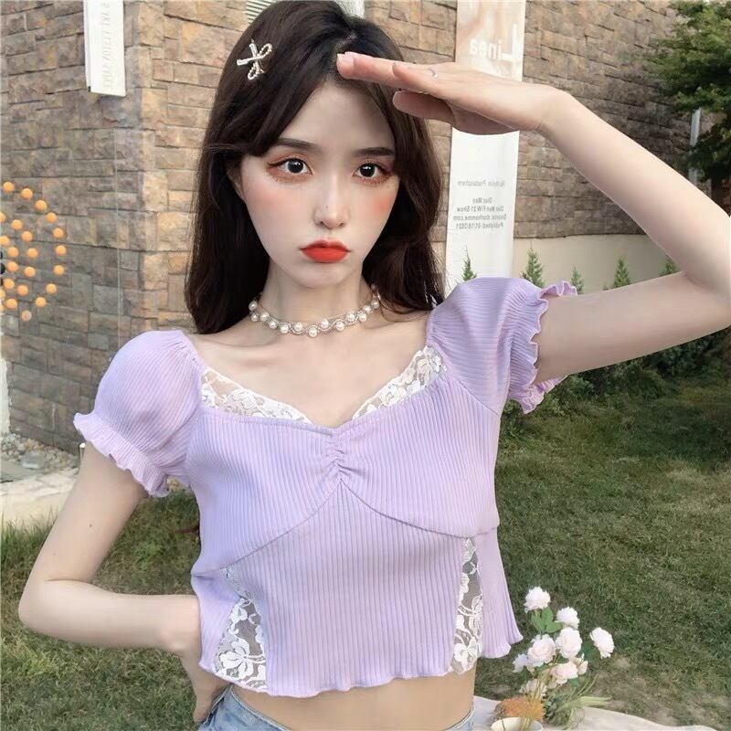 レースドッキングデザインがお洒落な春カラーのトップスです。