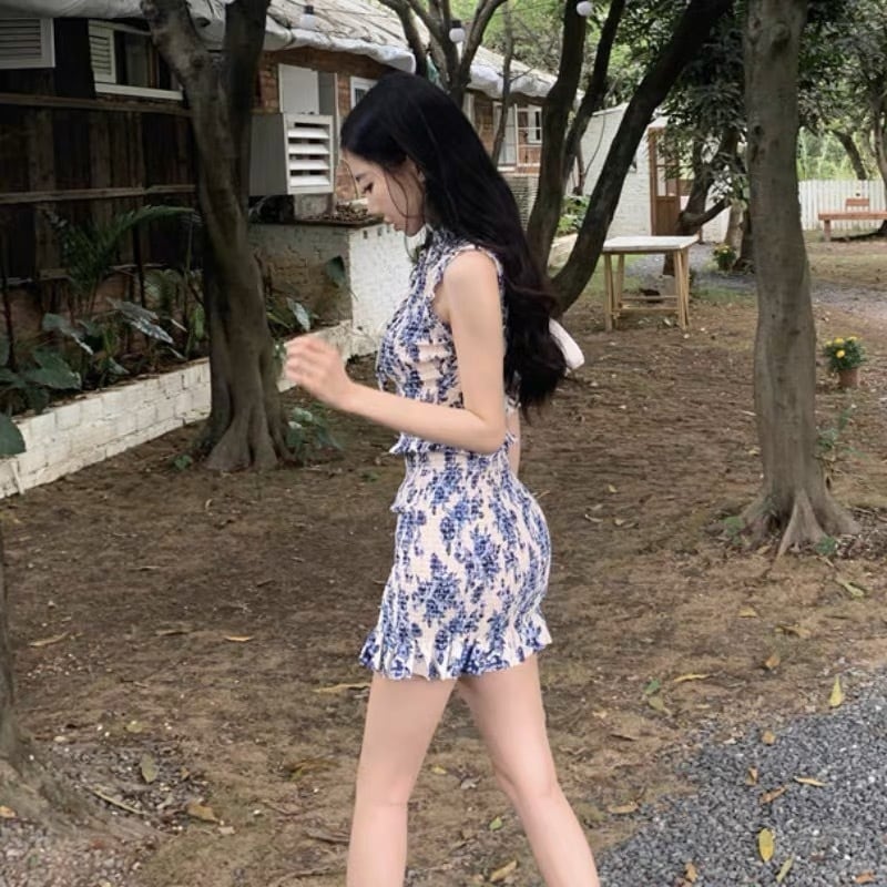 スタイル良く見える花柄のミニ丈ワンピースです。