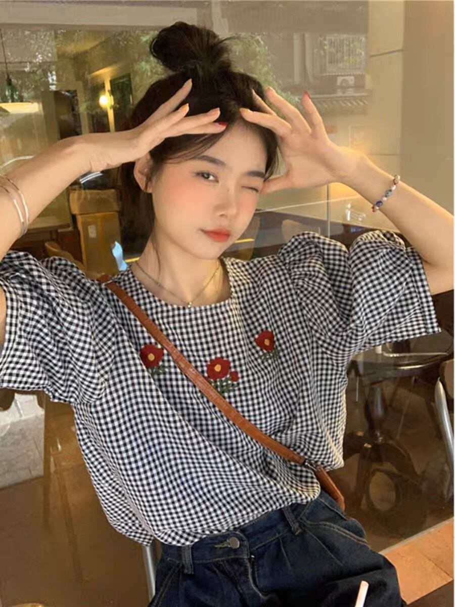 花柄刺繍が可愛いチェック柄のトップスです。