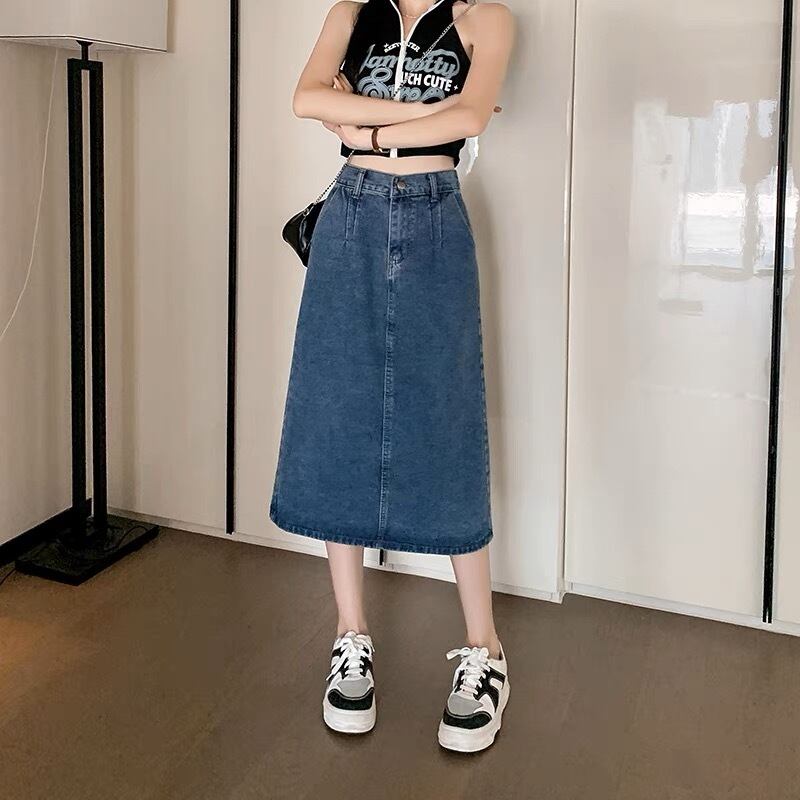 どんなコーディネートにも合わせやすいデニムのミモレ丈スカートです。