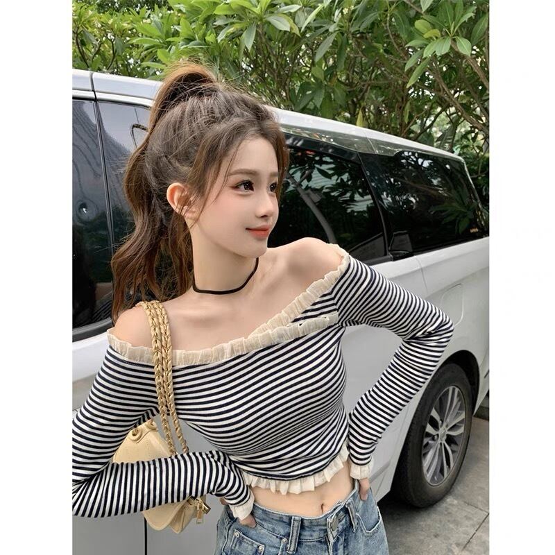 オフショルダーがお洒落なボーダー柄のトップスです。
