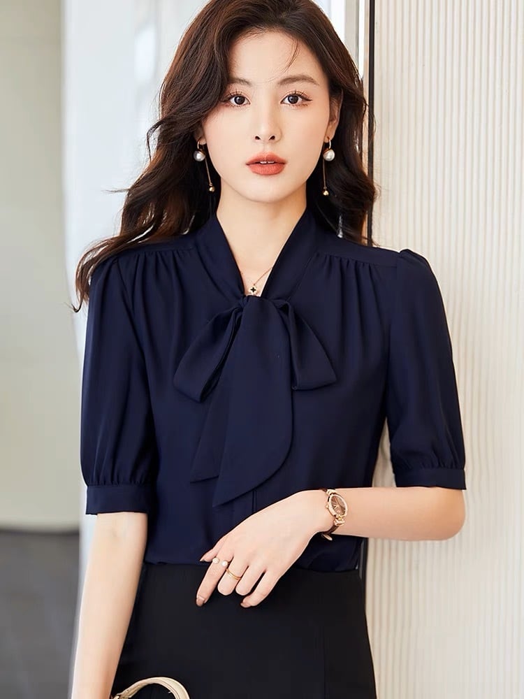 エレガントなリボンがポイントの、女性らしい雰囲気にぴったりのブラウスです。