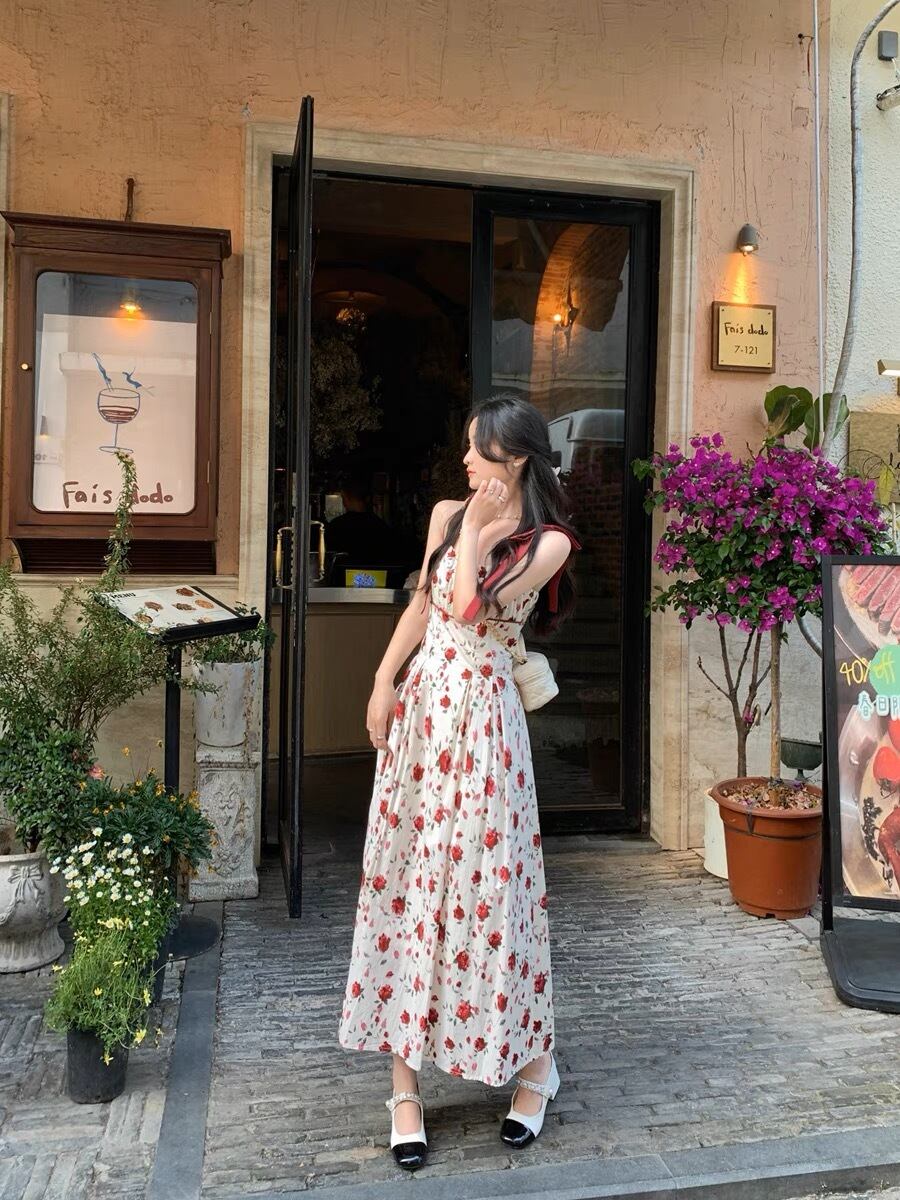 赤いバラ柄が可愛いロング丈ワンピースです。