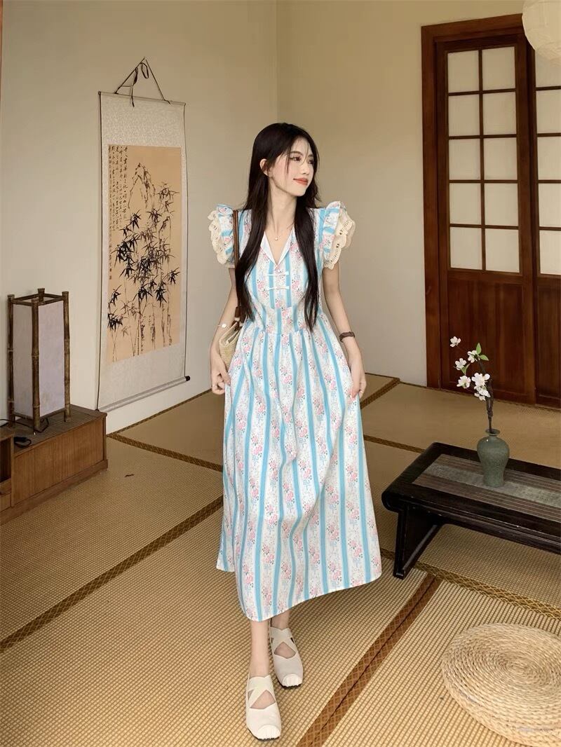肩フリルが可愛いブルーの花柄ワンピースです。
