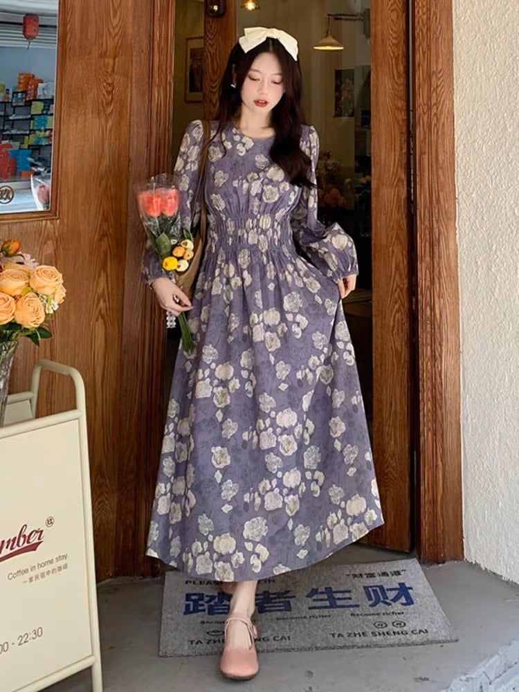 淡いカラーが可愛い花柄のロング丈ワンピースです。