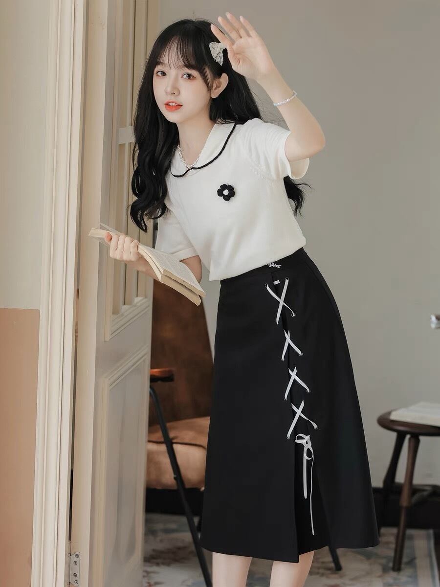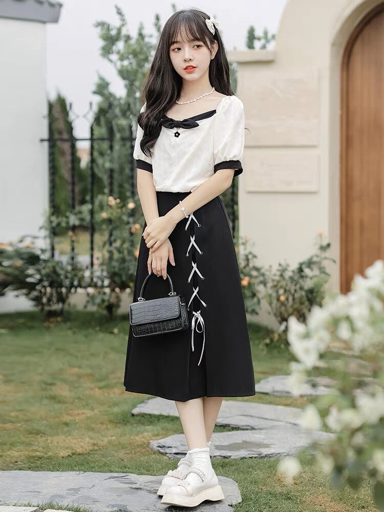 バイカラーがお洒落な清楚系の膝丈ワンピースです。
