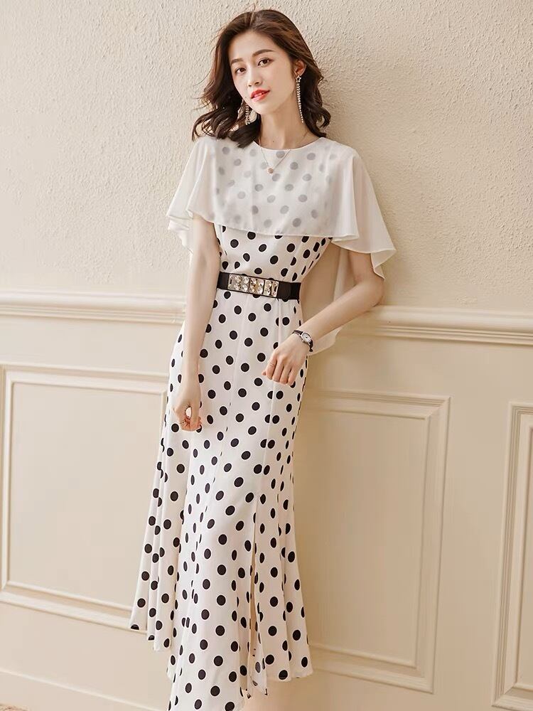 スタイル良く見えるドット柄のベルト付きワンピースです。