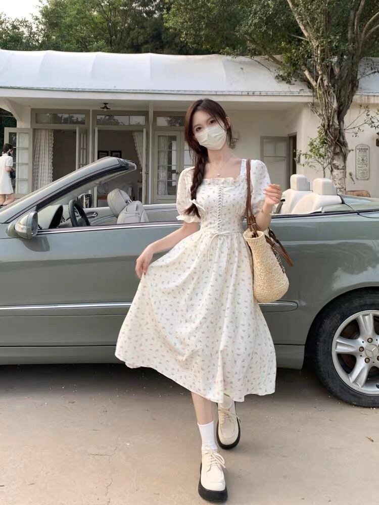 スクエアネック花柄膝丈ワンピース G105CON0066