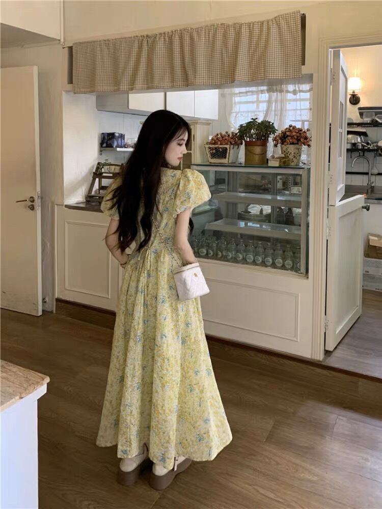 淡いイエローの花柄が可愛いロング丈ワンピースです。