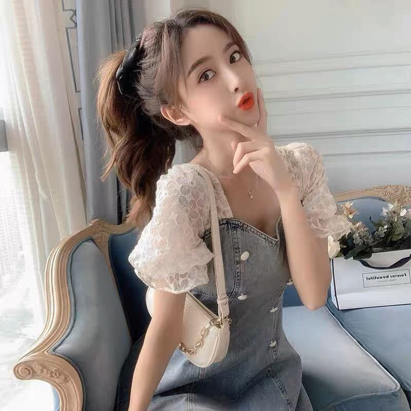 花柄レースのドッキングデザインが可愛いデニムのミニ丈ワンピースです。