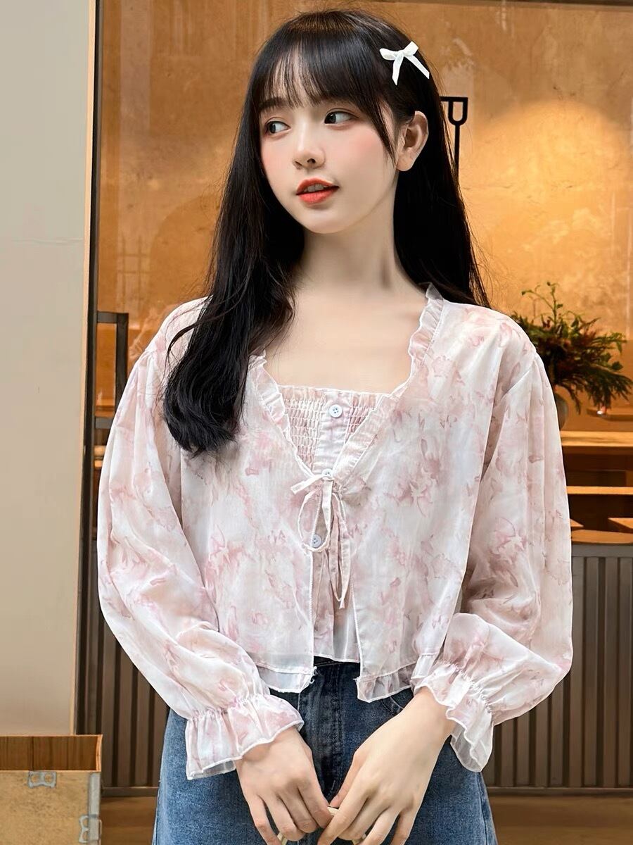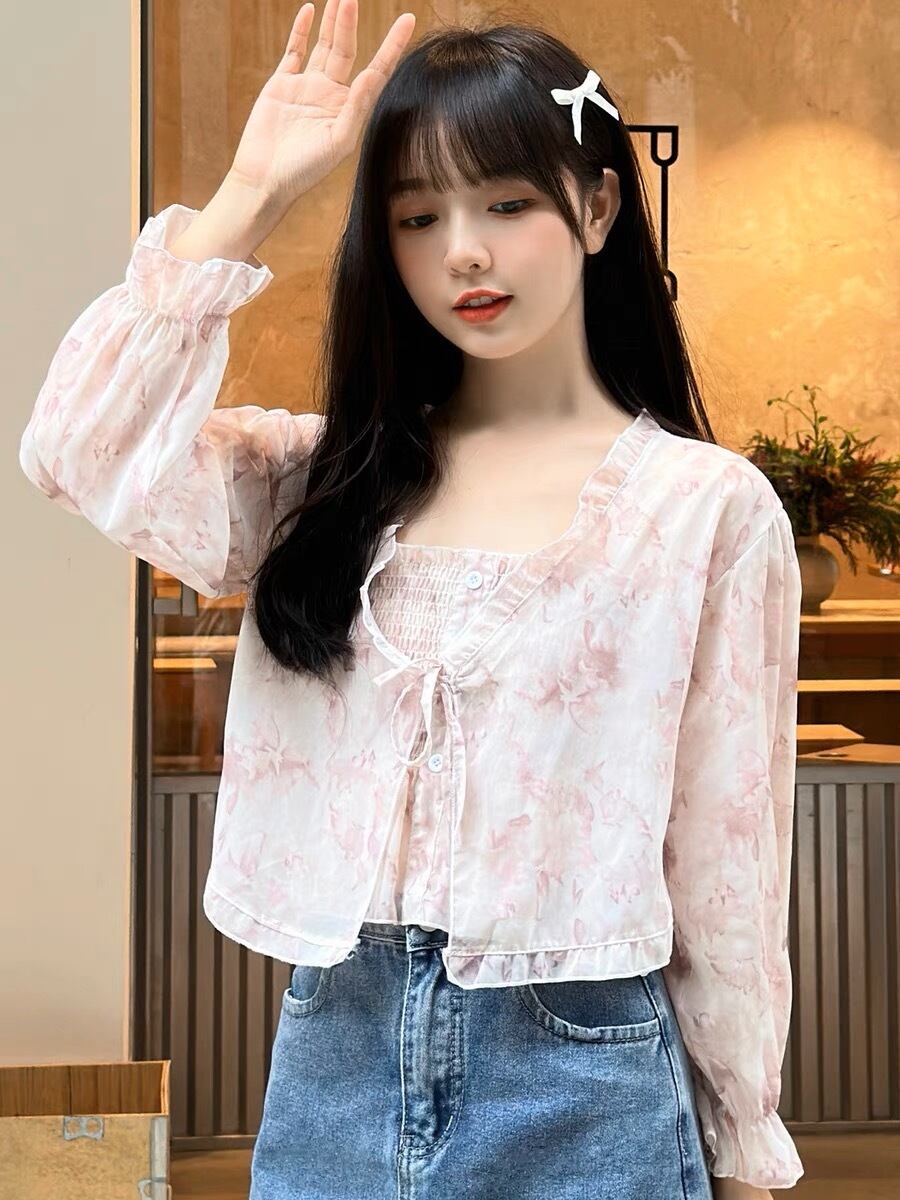 淡いピンクの花柄が可愛いシフォントップスです。