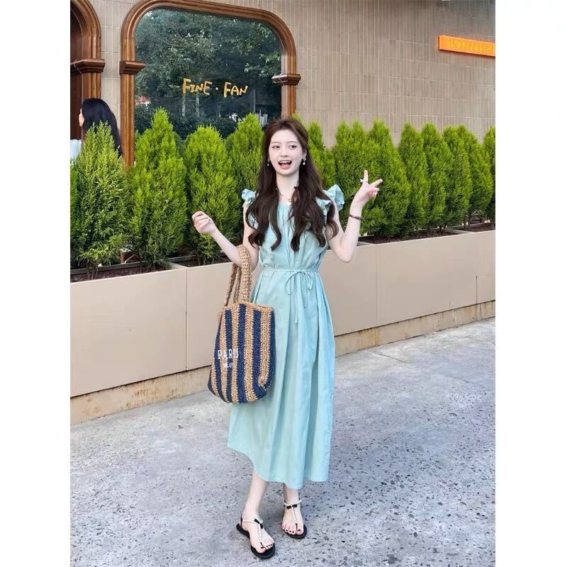 淡いカラーが可愛い肩フリルのロング丈ワンピースです。